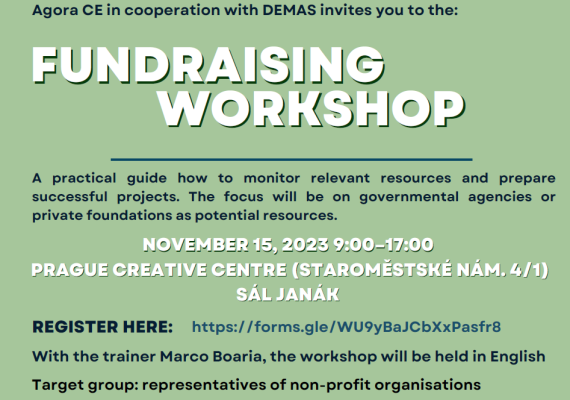 Zveme Vás na „Fundraising“ workshop, který se koná ve středu 15. listopadu v Pražském kreativním centru, Staroměstské náměstí 4/1 – sál Janák v čase od 9:00 do 17:00. Workshop se zaměří na jiné zdroje než velké evropské fondy, například na vládní agentury nebo soukromé nadace. Více informací zde.