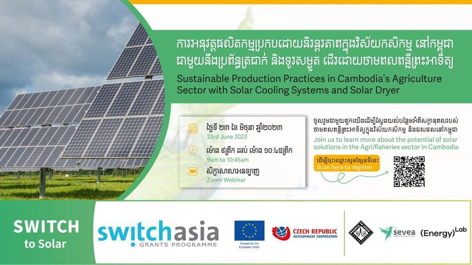 Člověk v tísni, Sevea a EnergyLab Cambodia pořádají 23. června webinář týkající se udržitelných výrobních postupů v kambodžském zemědělství. Dozvíte se například, jak fungují technologie solárních chladicích systémů a solárních sušiček či jaký potenciál mají solární řešení v kambodžském zemědělství a rybářství. Více informací zde.
