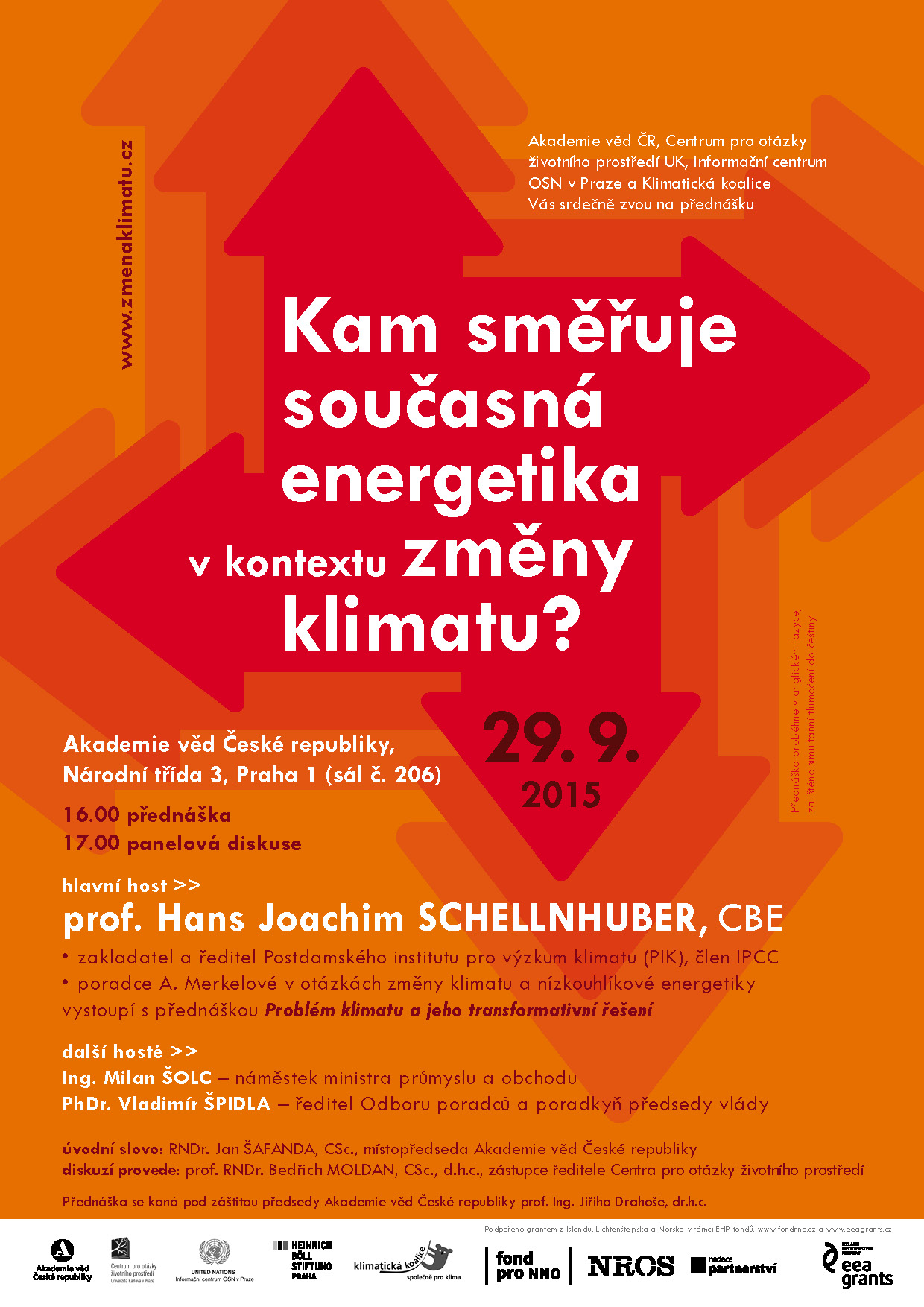 Jménem Akademie věd České republiky, Centra pro otázky životního prostředí UK, Informačního centra OSN v Praze a Klimatické koalice přinášíme pozvání na přednášku prof. Hanse Joachima Schellnhubera s názvem Globální problém a jeho transformativní řešení, která proběhne 29. 9. 2015 od 16:00 v sídle Akademie věd České republiky v rámci konference Kam směřuje současná energetika v kontextu změny klimatu?