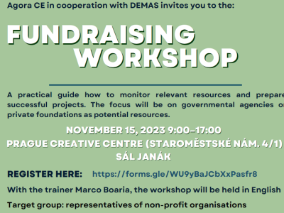 Zveme Vás na „Fundraising“ workshop, který se koná ve středu 15. listopadu v Pražském kreativním centru, Staroměstské náměstí 4/1 – sál Janák v čase od 9:00 do 17:00. Workshop se zaměří na jiné zdroje než velké evropské fondy, například na vládní agentury nebo soukromé nadace. Více informací zde.
