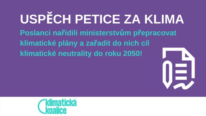 Zástupci spolku Česko za klima předali v prosinci vládě a poslancům podpisové archy petice požadující, aby vrchní státní představitelé začali aktivně jednat v ochraně klimatu. Výbor pro životní prostředí poslanecké sněmovny nyní na základě petice zaúkoloval Ministerstvo životního prostředí a Ministerstvo průmyslu a obchodu, aby přepracovaly české klimatické plány a zahrnuly v nich cíl klimatické neutrality do roku 2050. Více informací naleznete zde.