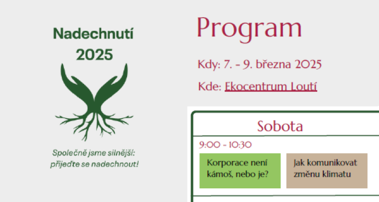 Nenechte si ujít Nadechnutí organizované v termínu 7. – 9. března v Ekocentru Loutí, (Rabyně). Nadechnutí III je třídenní neformální konference environmentálních organizací a kolektivů, která navazuje na úspěšné akce z let 2014 a 2022. Chceme společně vytvořit prostor, kde se můžeme pobavit o tématech, kterými hnutí aktuálně žije, zaměřit se na budoucí výzvy, ale taky se prostě jenom potkat napříč organizacemi i generacemi a strávit spolu hezký čas. Těšit se můžete na panelové diskuze, workshopy i večírek. Nahlédněte do programu setkání. Registrace je nutná přes formulář.