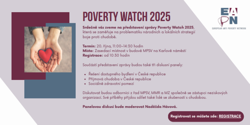 Srdečně Vás zveme na představení zprávy Poverty Watch 2025, která se zaměřuje na problematiku národních a lokálních strategií boje proti chudobě. Součástí budou také diskusní panely o řešení dostupného bydlení, příjmové chudobě nebo sociálně-zdravotním pomezí.