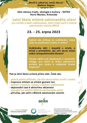 Letní škola MZU 2023 je ideální příležitostí pro vzdělavatele, kteří se zajímají o posilování vztahu k místu ve vzdělávání. Škola se koná od 23. do 25. srpna v Horním Maršově a je akreditována MŠMT. Účastníci se budou učit, jak využít místně zakotveného učení ve výuce a budou mít možnost sdílet své zkušenosti s ostatními. Přihlášky je třeba podat do 25. června a cena zahrnuje program, ubytování a plnou penzi. Více informací zde