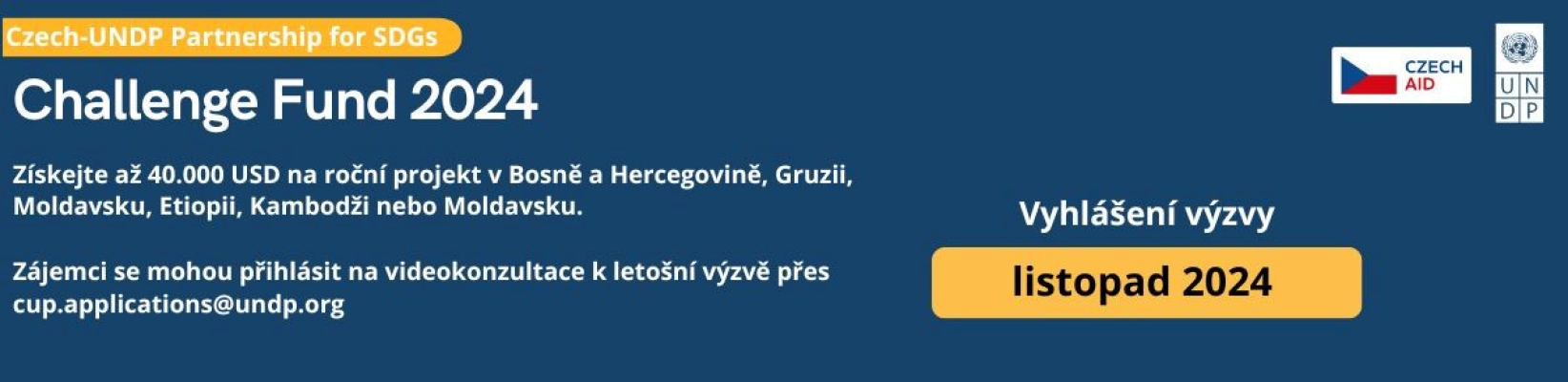 Czech-UNDP Partnership for SDGs každoročně vyhlašuje výzvu Challenge Fund, která je určená českým soukromým firmám, univerzitám, výzkumným centrům a neziskovým organizacím. Challenge Fund hledá inovativní řešení pro partnerské země v mnoha oblastech včetně technických inovací, zemědělství, nakládání s odpady, zdravotnictví, komunitním plánování nebo implementaci moderních technologií v dopravě. Termín vyhlášení letošní výzvy je plánován na listopad 2024, přesné datum otevření přihlášek bude zveřejněno brzy. Více informací zde.