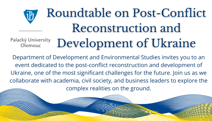 Zveme Vás na kulatý stůl Katedry rozvojových a environmentálních studií PřF UP v Olomouci na téma „Postconflict reconstruction and development“ se zaměřením na Ukrajinu, který se uskuteční ve čtvrtek 17. 10. od 15:00 do 17:00 v Pevnosti poznání PřF UP v Olomouci. Diskuse bude v anglickém jazyce a bude také streamována online. Více informací zde.