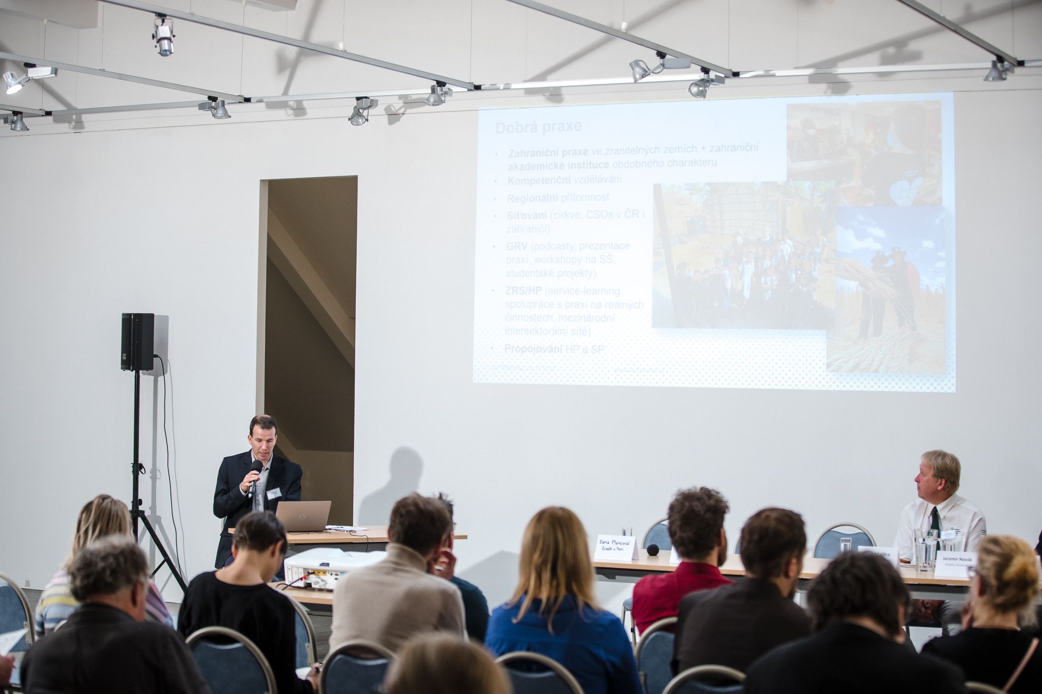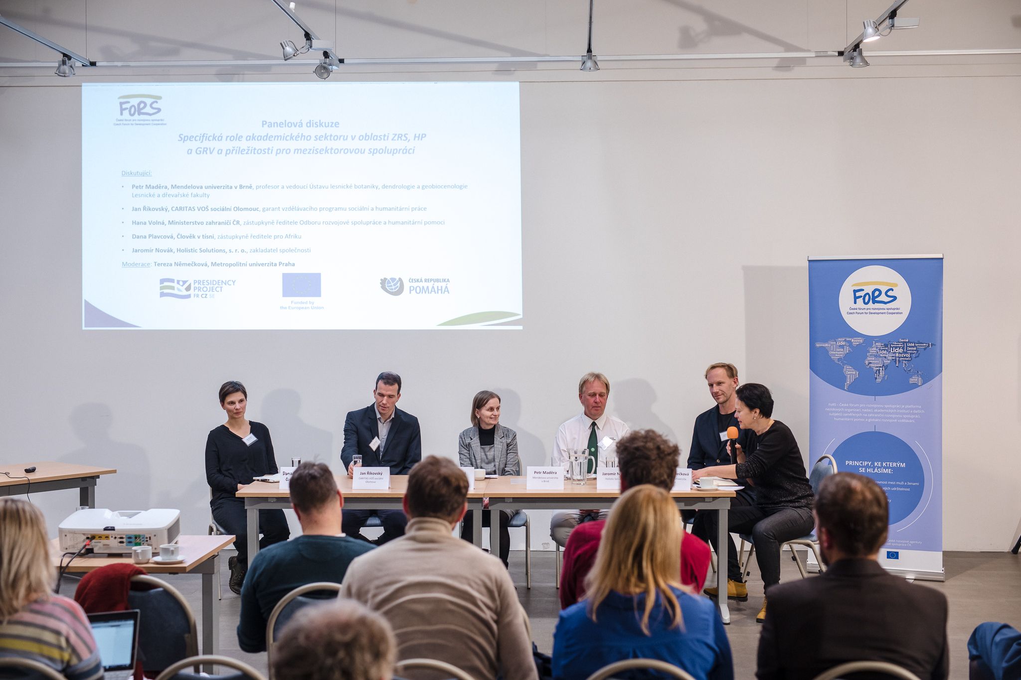 Navazující veřejná část programu byla především o propojení akademického, neziskového, veřejného a soukromého sektoru. Naším cílem bylo přiblížit činnost akademického sektoru v zahraniční rozvojové spolupráci a humanitární pomoci, prodiskutovat jeho specifickou roli a možnosti mezisektorové spolupráce.